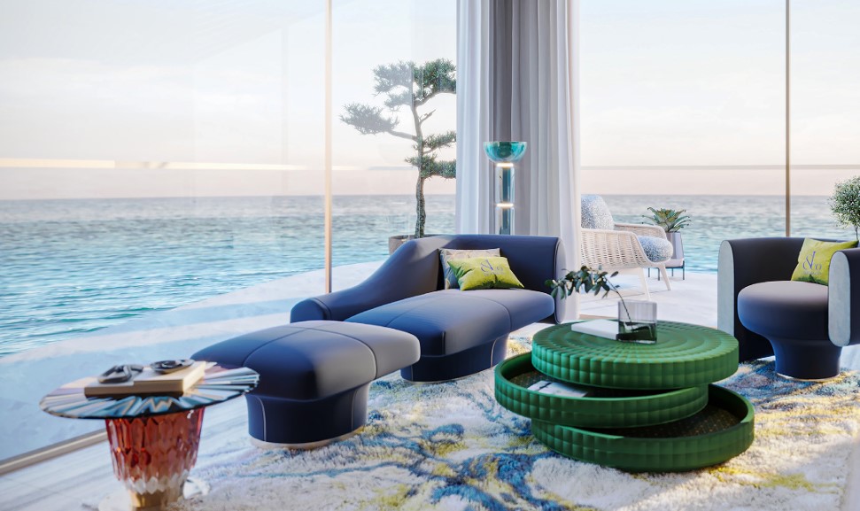 Each residence features panoramic sea views, open‑plan layouts, and premium finishes inspired by Jacob & Co’s luxury lifestyle philosophy.